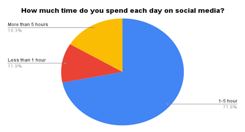 Figure 11 shows the count of responses to the question, “How much time do you spend each day on social media?” The chart shows that 16.3% of the 202 people have responded ‘More than 5 hours’, and 11.9% have responded ‘Less than 1 hour’. The majority of 71.8% have responded ‘1-5 hours’. The chart shows that most of these people who use social media spend 1-5 hours a day on them. The number of respondents agreeing on the hours they spend on social media shows a symptom of addiction that they cannot at times control. Sometimes leisurely scrolling through Instagram reels and posts, or even YouTube shorts, can take up much more time than we can control. ·