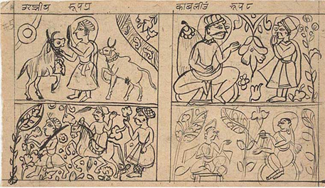 Palm leaf manuscripts are two feet in length and 2.5 inches in height were made. All these folios were enveloped with the wooden covers. Tiny illustrations were drawn to decorate these with flat colours and bold lines. In earlier times images served as an auxiliary element to the text. These manuscript illustration books were deposited into the religious libraries which were chiefly flourished in western India, largely patronized by rich Jain merchants. Generally, the manuscript page was written first and space left for the illustration, to be painted later. Sometimes the painting and writing were followed at each stage. After the correction of the outline drawing, the surface was covered with thin coat of zinc oxide that fills the pores of the paper and made it as smooth and impervious to the liquid colour. The final drawing was made with the aid of outlines visible through this coating. When the picture was finished, then the reverse side was burnished. The illustrated side was placed on polished marble slab, burnished with agate stone until it gets a mellow glow to the surface. The different colour coatings were applied to the picture one after the other. In every step this burnishing process was repeated. Each colour was allowed to dry completely before the next was applied. The colour coatings were often applied very thin in order to prevent the flaking. An order was followed for the application of colours. At first the fore ground and backgrounds then body colours, clothes, and articles. And finally, out lines were used to emphasis the finishing touches of pearls and ornaments and rendering of the hands, lips, and feet.