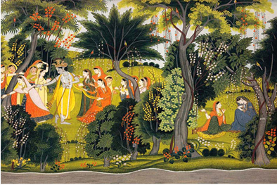 The work of the Mughal period, besides its adoptions of European elements which ushered Indian painter towards the rendition of the optical perspective the suggestion of deep space can be seen in the painting of “Seize of Ranathambur”. The reduced size of images was placed at the upper corner of the composition, then the images rendered at the foreground. The diagonal compositions of armies across the surface creates motion into a particular direction. In the early paintings of the Hindu text, Bhagavata purana of 1550 A.D. and “Gita Govinda” of 1580 A.D., space has been suggested with several planes.