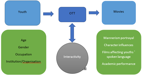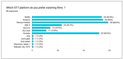 The graph above shows the respondents' favourite OTT platform. The greatest value of the 59 respondents next to DISNEY + HOTSTAR The biggest value is next to Amazon, at $55. The most respondents, 54, are from Netflix. Sun Next has 11 (12.8%) respondents, Netflix has 54 (62.8%), YouTube has 52 (60.5%), and Sun has 11. 5. FINDINGS The study has discovered that characteristics and mannerisms have a significant impact on young people. The researcher found that watching OTT movies has an impact on the psychological well-being of the young people. Watching movies on OTT has impacted young people's spoken language and academic achievement. 5.1. CONCLUSION Researcher have discovered that OTT movies affect young people's psychological states, mannerisms, and dressing habits. The majority of respondents watched OTT movies for 3 to 4 hours, with some being neutral and the majority of them agreeing. Films are the OTT entertainment that young people most like to view. The most popular OTT platforms among young people are Disney+ Hotstar, Amazon, Netflix, and YouTube. The most popular device among young people is the smartphone. Researchers have discovered that Tamil, English, Malayalam, and Hindi are the most popular languages among young people in Chennai. OTT technology has made numerous languages available to consumers around the world.The study reveals that youth are influenced by the characters in OTT films and that these films have an impact on young people's spoken language. Some respondents claimed that watching movies had little bearing on their academic achievement, while others had neutral on their selections. When compared to OTT's mannerism representation films, which had a higher significant value of.731, psychological shift has a greater significant value of.894 in an Annova test. The researcher came to the conclusion that OTT movies affect young people's mannerism and psychological well-being as a result. According to a single sample t test, the average amount of time spent watching movies over-the-top (OTT) varies from lower value of 2.39 to higher value of 2.82, with a mean difference of 2.605. Comparatively, the dressing style portrayed in OTT movies has a mean difference of 2.221, with lower values of 2.00 and higher values of 2.44. With a lower value of 1.05, a higher value of 1.29, and a mean difference of 1.174, streaming movies is also practical. To determine how watching OTT movies impacts young people's academic achievement cross tabulation is done. The largest value of the age variable is seen in the twenty-three respondents who are between the ages of 18 and 22 who disagree that viewing movies on streaming services has an impact on young people's academic performance. Two of these respondents are between the ages of 23 and 25. Cross-tabulation with age and how watching OTT films affects young people's spoken language are both shown. The twenty-five respondents who firmly believe that viewing OTT movies affects young people's spoken language, eight of whom are in the twenty-three to twenty-five age range, represent the biggest value of the age variable. Characters from OTT movies that have an impact on young people are cross-tabulated according on gender. Twenty-five of male respondents strongly agree that OTT personalities have an effect on young people, and fourteen out of fifteen female respondents agree as well.
