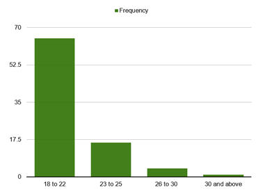 Regarding the age range, 75.6 percent of the respondents fall within the 18 to 22 year old group, 18.6 percent fall within the 23 to 25 year old group, 4.7 percent fall within the 26 to 30 year old range, and another 1.2 percent fall within the 30 and above range. It demonstrates how effectively people in the 18 to 22 age group are using OTT to watch movies. Figure 2