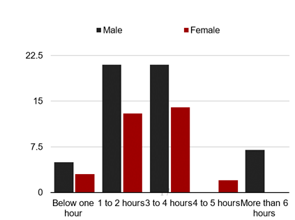The table above shows a cross-tabulation of gender and the number of young people who view movies on streaming services. The biggest number of male respondents, 21 watch OTT movies for one to two and three to four hours, while the lowest number of respondents, 14, watch OTT movies for three to four hours. Figure 3