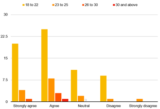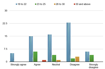 The cross-tabulation between age and how watching OTT films influences young people's spoken language is shown in the previously mentioned table. The largest value of the age variable is found in the twenty-five respondents who strongly think that watching OTT movies influences young people's spoken language; eight of these respondents are in the twenty-three to twenty-five age Range. Figure 5