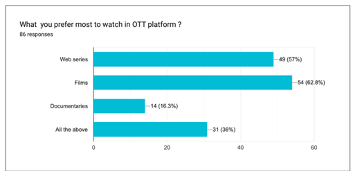 What viewers choose to watch on an OTT platform is seen in the chart above. The majority of OTT users favour films over web series and documentaries since they have the most value out of 54 (62.8%) respondents. There are 14 (16.3%) documentaries and 49 (57%) web series. Figure 8