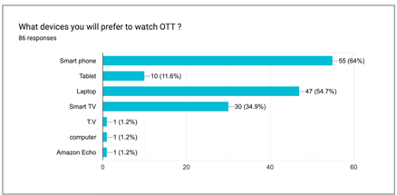 The graph above shows the respondents' favourite Device. In comparison to the other 55 responders, the smartphone has the highest value. The laptop is closest to it, with a value of 47. The highest response rate for smart TV was thirty. Figure 10