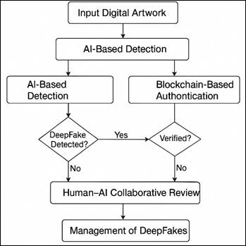 The system is built on the combination of computational intelligence, secure provenance tracking, and expert validation, which has high detection accuracy and ethical reliability. Its modular design provides flexibility to a range of art forms and blockchain provides traceability and a verified non-corruption-proof method- provides an end-to-end solution to finding and combating DeepFakes in digital art spaces. 3) Limitations Although it performs well, the framework is computationally intensive and needs the presence of experts, which could be a scalability problem. The cost of transactions and delays caused by blockchain might become an impediment to real-time validation. Moreover, the accuracy of models can slightly decrease when new DeepFake methods or off-distribution artistic abstractions are provided. 7. Conclusion In this study, the complete scheme of DeepFake Detection and Management in Visual Arts was proposed, which combines the AI-based detection, blockchain authentication, and human-AI collaborative review to guarantee authenticity, ethical responsibility, and digital trust. The results have been able to show that convolutional and transformer-based AI models were successful in detecting manipulated artworks with an accuracy of more than 92 percent, and blockchain authentication ensured tamper-proof provenance verification. The combination of technology and human judgment was most successful and the hybrid system with the support of expert human analysis achieved the largest percentage of 94.1%, which was the highest level of performance. To the artists and curators, the framework provides a safe method of safeguarding the integrity of the creativity and assures of originality, safeguarding against digital forgery. In moral terms, the paper highlights the need to come up with responsible AI systems that will not infringe on artistic freedom and encourage abuses. It also supports media literacy programs to enable users to distinguish between fuzzy material and enjoy the genuine digital art. The further development is aimed at hybrid AI-blockchain systems that have adaptive learning mechanisms to update DeepFake techniques and regulation systems to establish the rule of authenticity of digital art. Taken together, the provided system helps to create a sustainable, trustworthy and ethically controlled digital art space, which is one of the most vital issues in the era of smart media production.