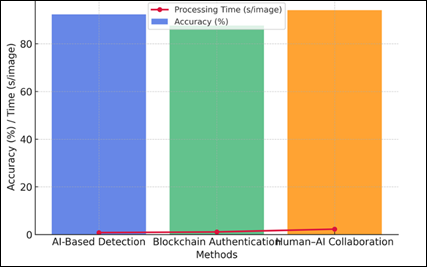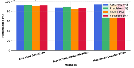Figure 2 Comparative Performance of Detection Methods Figure 2 represents the performance of three detection methods in comparison with each other, and it can be determined that the Human-AI Collaborative model presented the best accuracy and F1-score. Detection with AI was effective and blockchain authentication, being slower, did guarantee uniform reliability and secure provenance validation. Figure 3