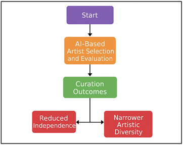Figure 2 Process Flow of AI’s Effect on Curatorial Autonomy and Artistic Range Figure 2 shows the influence of AI, which is balancing the curation controls and artistic diversity. This change is a test of the diversity and lack of consistency of the creative ecosystem. Also, depending on automated insights could change the job of the editors from making decisions to interpreting data, which would make them less authoritative and being able to use their own experience. 3) Balancing