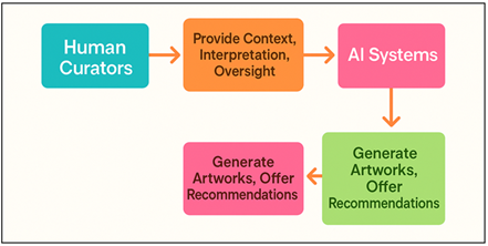 challenges in understanding AI systems and outputs This lack of clarity, which is often called the "black box" problem, makes it very hard for editors to understand, analyse and show AI artworks in a useful way. The technological issues include not only the comprehension aspect but also the organizational aspect of the show. For AI art to be exhibited, it may require special hardware or software settings, or constant data connections. All of these things require people who are artists, programmers and engineers to work together across disciplines. This is because unlike printed pieces, algorithmic installations/interactive works do not have a straightforward process of showing, as they require frequent updating, problem-fixing, and computer resource management. Also, managers have to cope with the fact that dynamic systems are difficult to forecast. Because the results of AI can change from one version to the next, the decision of which version it should display and how to frame its change is simultaneously a philosophical and technical decision. 4. Approaches and Frameworks for Curation 4.1. Human–AI collaborative curation models Human-AI joint curation is a newly conceived framework for planning art exhibitions, based on the idea that the human editors' semantic interpretation and the AI's computational power can be combined effectively in planning the optimal displays. This model doesn't view AI as simply a medium for creation of art. It considers it as a partner in the decision making for curators. AI can help with things like looking for patterns in art, guessing how interested an audience will be or finding themes that run through huge art collections. Figure 3