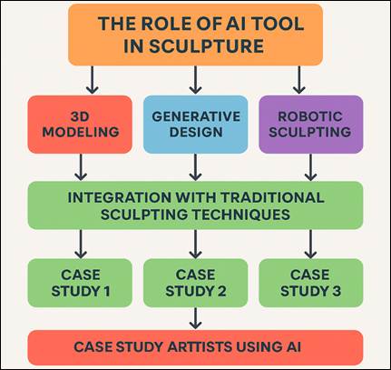 ability to predict structural behavior and minimise material wasteage. 7. Conclusion The introduction of artificial intelligence into the modern sculptural art is a turning point in the history of the development of the artistic skills. The technical and conceptual possibilities of artists have been expanded due to the AI tools, including generative design systems, and robotic fabrication. This study shows that AI contributes to creative ideation, speeding up the work of prototyping, and enabling the creation of more complex shapes than was possible before. Consequently, sculptors can challenge the conventional boundaries, experiment with new aesthetic words, and use experimental processes that debrief the conventional ideas of artistry. Concurrently, the research has shown that such technological innovations should be adapted carefully. On the one hand, AI is truly beneficial; however, on the other hand, it confronts sculptors to keep their skills and the sense of materials and touch, which are the main aspects of sculptural identity. The equilibrium between the digital and offline approaches proves to be a decisive element in preserving the autonomy of art. Instead of replacing craftsmanship, AI transfers the role of a sculptor to the role of creative direction, critical assessment and hybrid practice. The school and workplaces will need to be adjusted and change towards a more AI literate training where the previously existing manual skills would not be lost, but would be included in the training programs. On the one hand, AI offers a great opportunity to new artists: it can be used as a potent innovation engine, and it asks them to constantly learn both in the artistic and technological arena.