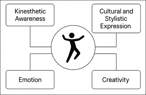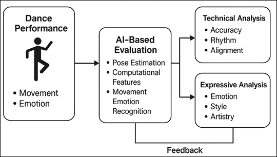 The intelligent systems provide audience with continuous and personalized feedback that develops with the development of the dancer. Rather than apply generalized corrections, AI-based models can give up details about recurring errors like delayed footwork, insufficient arm extension, or the lack of consistency in center-of-mass control and suggest the specific micro-corrections. Such accuracy is helpful to dancers of all abilities, including those trying to learn the basic technique and the professionals developing advanced movement vocabulary Zhang (2023). The transition between the occasional feedback of the instructors to continuous data-driven feedback promotes faster skill development and improves the efficiency of training. The latest developments in affective computing and movement emotion recognition have provided the avenues of studying expressive qualities in dance. The patterns of movement-effort, facial expressions, and the distribution of energy through time can be trained with models to assess the elements of emotional clarity, stylistic authenticity that are essential to classical, folk, and contemporary dance styles Zhenyu (2025). This will fill the gap between technique and artistry so that AI systems will not interfere with the expressive integrity that constitutes dance as an art form as shown in Figure 1. Notably, smart performance assessment is also effective in improving safety and injury prevention. Through the joint stress, movement asymmetry, and repetitive strain indicators, AI would be able to warn dancers of high-risk patterns before they are injured. This preventive measure is an aid to the well-being of dancers and their long-term sustainability. Although technological integration has massive benefits, there are such issues as cultural sensitivity, bias in algorithms, and the maintenance of individuality in art. Dance is very cultural, tradition-based and subjective; hence, smart systems should be created to enhance but not to override human creativity. It is necessary to ensure the authenticity of dance traditions with the help of ethical data collection, culturally diverse training data, and open assessment models. 2. Dance as an Embodied Creative Practice Dance is essentially an embodied art since it is the body that is the medium and instrument of communication. Dance is not based on any external object like paint, clay, or musical instruments as is the case with other creative practices. This imbibition renders dance distinctly immersive, in that there is creation of meaning through movement, gesture, rhythm, breath, and expressional motive. Bodies of the dancer are the dynamic interface between the internal feelings and outside surroundings and provide an endless negotiation between technique, creativity, and personal interpretation Ishii et al. (2024). Fundamentally, dance is influenced by kinesthetic awareness the knowledge of the dancer about posture, balance, flow of energy, and space orientation. Training enables the dancers to have an intuitive mastery of muscle coordination, movement directions, and expressive dynamics. Kinesthetic intelligence gives the performers the ability to perform complicated choreographic patterns as well as express emotion and narrative by making slight changes in the quality of movement. Such complicated combination of physical and emotional intelligence makes dance a process in which it is impossible to separate expression and the body itself Chéron et al. (2015). Figure 2