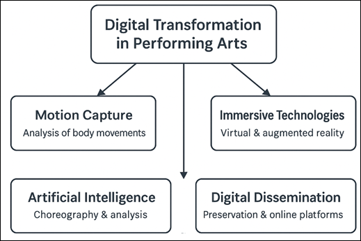 Dance is a place of tradition, identity and collective memory, which is culturally bound. Each culture has its set of moving words, gestures, rhythms, and aesthetic values. In the classical tradition of Bharatanatyam, Ballet or Flamenco, mastery of the disciplined movements and the style of nuances is required. Community stories, rituals, and local identity are reflected in folk dances and experimentation, fluidness and individualistic expression adopted in contemporary dance Yao et al. (2011). This heterogeneity underlines the fact that dance is not simply physical movement but is rather a textualized culture of generations of practice, history as well as being a meaning-making process as shown in Figure 2. Emotion is the other important aspect of embodied dance practice. Emotional intention of the dancer has an impact on the movement texture, timing, modulation of energy and the clarity of the expressive value as a whole. Dancers use the use of embodied emotion in order to communicate with their audiences whether it is pleasure or pain, fidelity or defiance Liu et al. (2023). Dance improvisation, exploration of choreography and individualized interpretation creates creativity in the field of dance. Dancers in even the most rigid classical traditions apply individuality in their performance by micro-differences in expression, timing, and energy. This artistic independence is very fundamental to the artistic character of dance; this guarantees performances to be one in a thousand and highly intimate. Due to this reason, dance cannot be boiled down only to parameters of measures in movement; it should be perceived as a holistic embodied practice that incorporates both technique and human craftsmanship. In terms of training, dancers go through repetitive patterns of practice, contemplation, and perfecting Singh et al. (2021). Embodied learning is dependent on sensory feedback in terms of visual, proprioceptive, auditory, and tactile information that is used to make dancers internalize movement pathways and perfect emotional expression. In that regard, the intelligent evaluation systems should not disregard the embodied character of dance and make sure the computational measures will complement artistic individuality but not limit it. To really help dancers, the smart systems should realize that dance is not only related to performing the right movements but being in the movements with the authenticity of expression. 3. Digital Transformation in Performing Arts Rapid changes in digital technologies have brought the performing arts environment to a major metamorphosis in the last decades. Computational tools, immersive media, motion-sensing systems, and artificial intelligence have had an immensely strong impact on dance, in particular. The technologies have not only transformed the way performances are created, taught and experienced but also the way dancers conceptualize movement, space and embodiment Khosla et al. (2021). With the ever-increasing effects of digital innovation, which is shifting the physical and virtual to become one and the same, dance is presented as an unusually fluid locus of interdisciplinary creative activity as artistic practice and technological intelligence intersect. The transformation of digital motion capture systems can be listed among the most influential processes. Motion capture was first utilized in animation and games but now it is an effective instrument to be used by choreographers and teachers who need to analyze body movements in a very specific way. Optical markers, inertial sensors, depth cameras (e.g., Kinetc, LiDAR) can enable choreographers to see the trajectories, timing patterns, spatial formations and qualities of movement in the three-dimensional space Ullah et al. (2022). The tools allow the analysis on a level that was hitherto not able to be seen with the human eye, which allows the choreographer to make more informed choices and provides the dancer with a comprehensive grasp of their movement structure. Figure 3