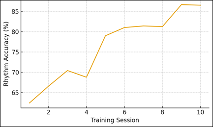 The line graph represented in Figure 4, shows that there was a gradual increase in rhythm accuracy with each new training session. The upward trend demonstrates that AI-based feedback is useful to dancers as they can gradually learn to move to musical rhythms. Small variations are normal fluctuations, yet the tendency of the improvement over time proves the effectiveness of the system in enhancing the musical timing and minimizing the off-beats. Table 4