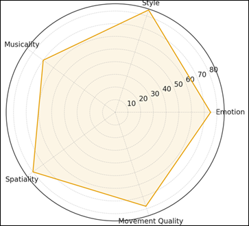 The radar chart represented in Figure 5 gives a global picture of the strengths and weaknesses of the dancer in terms of artistry. The high scores in style and spatiality underline high genre fidelity and coverage of the stage, whereas musicality is moderately lower, which indicates the opportunity to tune the rhythm. The visualization would be of great use when it comes to determining dimension-specific training requirements, so that expressive and technical areas could be specifically improved. Table 5