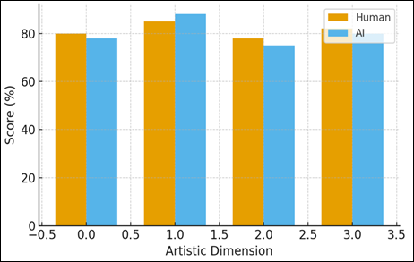 As illustrated in Figure 6, comparison indicates that there were areas of compatibility and discrepancies in human and AI assessors. The two are similar in their scoring patterns, which means that AI obtains key aesthetic cues. Minor disparities particularly in the style recognition indicate that AI can be better at recognizing patterns consistently whereas humans can emphasize more on emotional interpretation. This analogy proves the accuracy and supplementary essence of AI assessment. The critical element of the system validation is the extent of the correspondence between human experts and AI scores of the works of art. Figure 3 is a comparison of scores in emotion, style, musicality, and spatiality. The trend is very consistent with human and AI assessors with the difference falling within +-3-5%. It is important to note that AI was a little more sensitive to genre specific geometric and temporal cues than human assessors, with a higher score in style. On the other hand, human assessors rated more emotion which is in line with holistic and intuitive perception of human affect. Figure 7