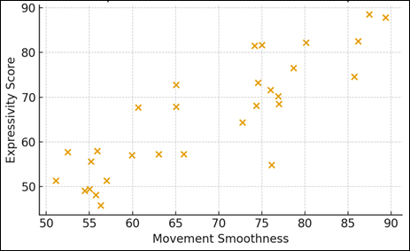 The scatter plot provided in Figure 7, shows that there is a positive relationship between movement smoothness and the expressivity. Dancers who have smoother motions paths have a higher score in expressive clarity. Although the correlation is not ideal to show that expressive performance also consists of the emotional intention and style subtlety the overall tendency is in favor of the hypothesis that the fine motion control increases the artistic effectiveness. This correspondence represents the ability of the model to emulate the most significant aspects of art and still have a decent level of interpretability. The minor difference in human judgment and AI judgment points to the successful hybrid strategy: AI is a master at objective stylistic evaluation, whereas a human is more capable of gauging narrative and emotional complexity. Making these two views work together may result into deeper evaluation and more detailed feedback. The intelligent evaluation model is also reliable and construct valid based on these findings. The small difference in the mean score of human and AI indicates a possibility of standardising assessment criterion and still allow expert judgment. Expressive quality can be referred to as the capacity of a dancer to put life into motion. This is studied in Figure 4 by a scatter plot between smoothness and expressivity. The affirmative relationship shows that the more dancers showed the use of controlled, fluid transitions, the more expressive they were. This is in line with the Effort Theory developed by Laban where flowing movement is usually linked to an expression of openness and a clarity of emotions. Non-linear dispersion of certain data points however also points to the fact that expressivity does not solely rest on the technical smoothness. Emotions intention, story setting, and culture style play an important role in expressive output. Indicatively, abrupt shifts, tension or roundedness are used deliberately as a tool of conveying meaning in some folk and contemporary styles. Therefore, such violations highlight the necessity of culturally sensitive AI models that will be able to identify the difference between technical roughness and an intentional style. 6. Conclusion This study has analyzed the dynamic nature of the intelligent performance evaluation in the training of dance where there is a convergence of the bodily artistry, the computational modeling and the digital innovation. Taking a comprehensive approach to the embodied practice, digital transformation, computational aesthetics, and AI-driven assessment of art, the study showed how technology could help dancers to perfect their technical accuracy and expressiveness. The experimental findings depicted significant changes in the accuracy of rhythm, clarity of style, and consistency of expressive features showing the possibility of intelligent feedback systems to improve the process of acquiring skills and creativity exploration. AI-based pose estimation, affective computing, immersive interfaces, and multi-modal analytics provide an excellent set of tools that can be used to understand movement quality in fine and culturally adequate terms. Although the system offers objective and data-driven information, it has value but it is supplementary to, rather than substitutive of human expertise. Human teachers introduce fundamental interpretative, emotional, and cultural knowledge which can never be replicated completely by AI. The consistency between human and AI rating also augers well the effectiveness of hybrid assessment systems which is a combination of both computational and artistic sensitivity. Simultaneously, the study also recognizes the difficulties concerning the bias of the dataset, the cultural variety, emotional interpretation, and the ethical accountability. These shortcomings will need to be tackled in order to create non-biased, culturally oriented assessment frameworks that would consider the diverse diversity of world dance cultures. Finally, it can be concluded that intelligent performance evaluation is not only a technological innovation but also a paradigm shift in the field of dance pedagogy. Through the adoption of cooperative AI-human methods, the future of dance training has the possibility of increasing access, accuracy, and creative possibilities of dancers around the world.