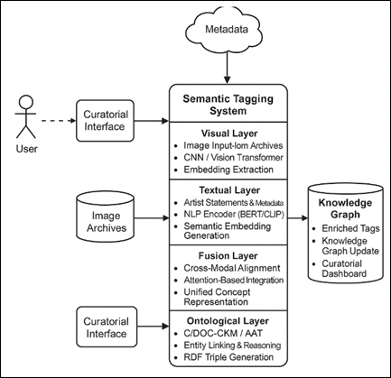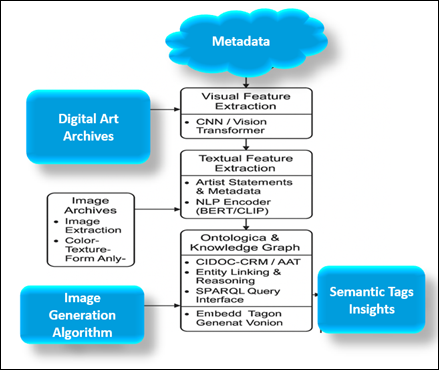 1. INTRODUCTION In its abstraction, experimentation, and close-to-the-bone expression, modern art speaks against the traditional structures of classification and description. The traditional metadata systems such as artists name, medium, period, as well as style cannot even describe the subtle color, texture, emotional, and conceptual texture that characterizes contemporary art production. Semantically meaningful metadata is lacking in the absence of rich, semantically meaningful metadata as museums, galleries, and digital archives digitize their collections, and hinder the effective discovery, analysis, and educational reuse of these collections. This has created the need to take interest in systems of AI-based semantic tagging that can discern the visual semantics and intent of artworks as well as their symbolic meaning Bonaduce et al. (2019). The recent developments in artificial intelligence, specifically in computer vision and natural-language processing, have completely changed the ability to read and write about visual culture. Multimodal cross-modal alignment between images and textual concepts is currently possible with deep convolutional neural networks (CNNs), as well as transformer-based multimodal networks, including CLIP and BLIP2. Nevertheless, what is difficult about contemporary art is not inherently visual, but more basic, semantic in nature, as to how machines can come to be aware of the conceptual content of art when the visual information is ambiguous, symbolic or stylistically distorted? To answer this question, it is necessary to go past detecting the features and onto semantic enrichment, where AI systems are directed by ontologies and curatorial knowledge and taken into context. The paper will suggest a unified system of AI-based semantic tagging that would allow filling the gap between visual embeddings and structured art knowledge Bunz (2023). Using deep feature learning alongside ontological idea-based rationale, the system comes up with multilayer semantic labels- which are inclusive of the object groups, emotional undertones, thematic links, and stylistic impacts. The products are semantically harmonized with an algorithm of a knowledge-graph alignment, which follows the cultural heritage standards, including CIDOC-CRM and Art and Architecture Thesaurus (AAT) Engel et al. (2019). Figure 1