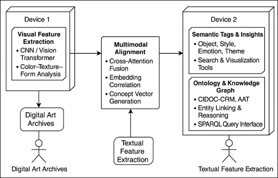 and Challenges Although such advancements have been made, there are still a number of gaps. The vast majority of AI models obtained on the basis of general image collections do not reproduce specific semantics of the modern art realm, including emotional abstraction, conceptual symbolism, or historical aspects. Moreover, bilinguality and cross-cultural representation are not studied extensively, and it constrains the inclusivity of digital art repositories on a global scale. Black-box quality of deep models is another aspect of the challenge that makes it more difficult to validate and ensure transparency of interpretation by curators. The solution to these problems has to do with hybrid systems wherein the representational strength of deep learning is combined with ontology-based semantic governance and feedback of curators-in-the-loop. 3. Conceptual Framework for Semantic Tagging The AI-based semantic tagging conceptual framework is a visual, textual, and ontological intelligence system that unites the three to form an integrated interpretive framework of modern art collections. The way it was designed is interdisciplinary in the interpretation of modern art, which is a mix of machine perception and curatorial logic to elicit a meaning beyond the aesthetic appearance of the surface. The framework provides a multilayered semantic architecture in which raw information of digital art repositories is increasingly converted to structured and machine-processable knowledge. At the lowest level, the Visual Layer receives the perceptual essence of works of art using the convolutional or transformer-based visual encoders. These models evaluate the attributes of the images, including the composition, the number of strokes of a brush, the patterns of chromatics and abstraction by geometric elements. The visual module does not simply label objects as conventional classifiers do, but rather creates semantic embeddings, which retain relational cues, i.e. spatial tension, emotional tone, or rhythm of style. These embeddings constitute the perceptual substrate where higher order semantic reasoning can process it. This process is enhanced by the Textual Layer which models linguistic and conceptual descriptions of works of art. Transformer based encoders such as BERT or GPT are used to process artist statements, exhibition notes, or curatorial narratives with the textual component. This makes sure that the tags created by AI are not in isolation of human interpretation but rather they are given a rich contextual nuance as shown in Figure 2. Visual and textual embeddings are co-optimized through cross-attention, and thus the model can match visual patterns with linguistic concepts (e.g. melancholy, industrial modernism or surreal dissonance). At the top is the Ontological Layer which brings in the structured reasoning by use of standardized vocabularies and knowledge graphs. This layer acts as a check to logical consistency and interpretive transparency so that the system understanding is consistent with the curatorial and scholarly taxonomies. The mapping process based on ontology uses entity linking, RDF triple generation and reasoning algorithms to draw higher-level concepts - e.g., relating angu abstraction to Futurist aesthetics or mechanical texture to Cubism.” Figure 2 |