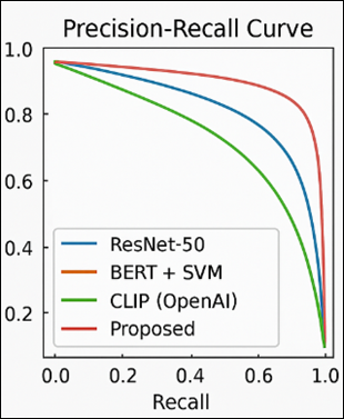 In the PrecisionRecall curve Figure 4, the area under the curve (AUC) of the proposed framework is always higher, which demonstrates superior discrimination of relevant and irrelevant concepts of ontology. This higher accuracy-recall ratio is due to the fact that the model simultaneously matches visual and textual context as well as ontological restrictions.