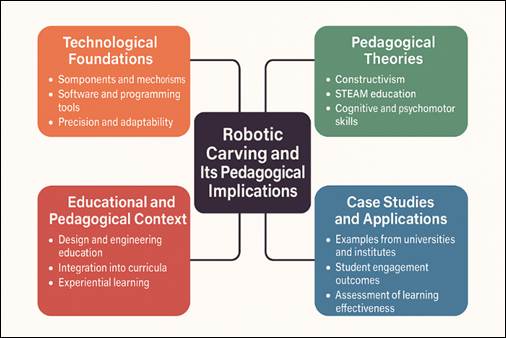 Figure 1 Overview of Key Components in Robotic Carving and Pedagogical Theory Students learn a rich and varied set of skills as they encounter the technical challenges of programming and calibration with the aesthetic and functional issues; connecting the analytical and the artistic. In Figure 1, the components of robotic carving are accorded with pedagogical theory. Besides, robotic carving opens the possibilities of collaboration and interdisciplinary learning. Teamwork among students with an engineering, computer science, design, and fine arts background, is often necessary in projects. The interaction process resembles the practice of innovation in the real world, where complicated issues are solved by using the collective experience and interdisciplinary viewpoints Kubilinskiene et al. (2017). The common learning space leads to communication skills, flexibility and appreciation of the various methodologies. Simultaneously, the adoption of robotic carving raises some significant concerns in terms of security, availability, viability, and ethical utilization of automated technologies. Teachers should think about the way in which they can combine such systems in a responsible manner so that everyone can have equal opportunities and be ready to work in the future, where the role of automation will become more and more central Roberts et al. (2021). These issues underline the necessity of considered curriculum development and research that will also investigate the non-technical implications of robotic carving, as well as its consequences. 2. Technological Foundations of Robotic Carving 2.1. Components and mechanisms of robotic carving systems Robotic carving systems are made up of an assembly of mechanical, electronic and computerized parts that interact to perform complicated subtractive manufacturing operations. The central element of these systems is a multi-axis robotic arm, which, as a rule, has 4-7 axes and can be highly maneuverable and have a long reach. The end-effectors fitted on this arm include spindle motors, milling tools, or carving bits that can cut, shape and texture materials Tercanli and Jongbloed (2022). These terminal devices can be changed or tailored to the needs of the project, which enables the robot to be used with a wide variety of materials such as wood, foam, stone, plastics, and soft metals. The arm motion is controlled precisely by the motor drivers, servo motors and encoders to allow the robot to track the toolpaths. The operational reliability is guaranteed by safety systems which include emergency stops, collision sensors and protective enclosures Baharin et al. (2018). The material being processed is held steady by a supporting structure e.g. a fixed or rotating worktable and dust-collection units assist in keeping the environment clean and under control. The latest robotic carving machines have force-feedback extruded on the machines, enabling the robot to modify its pressure and speed depending on the resistability of the material. The vision systems can include depth cameras or laser scanners, which can be used to enable a real time tracking, scanning, or adaptive carving processes. A combination of these elements creates a highly integrated system that has the potential to convert digital models to accurate physical representations, and robotic carving is an essential device in the modern design and fabrication environment Hafni et al. (2020). 2.2. Software and Programming Tools Used in Robotic Carving Robotic carving is critically dependent upon specialized software ecosystems which interpret design intentions as machine-readable toolpaths. The design and manufacturing process of products usually starts with a 3D modeling system like Rhino, Blender, Autodesk Fusion 360 or SolidWorks through which designers produce digital geometries. The models are then sent to CAM (Computer-Aided Manufacturing) software such as RhinoCAM, Fusion 360 CAM or PowerMill, which produces initial toolpaths depending on the tool diameter, solid density, spindle velocity, and cutting plan Zizka et al. (2018). Most popular software platforms used in robotic carving include robotic programming environments such as Grasshopper (with such programs as KUKA|prc and HAL Robotics), ABB robots RoboStudio, and robotic carving simulator RoboDK, which deals with toolpath optimization and kinematic analysis. These are used by designers to simulate the movement of the robot in a virtual world and identify possible collisions as well as improving trajectories prior to real implementation. Simulation is a very risk aversive method that ensures accuracy and assists in streamlining time and material consumption Mwangi et al. (2022). Depending on the model of the robot, low-level programming can be performed with the help of such a language as RAPID (ABB), KRL (KUKA Robot Language), or Python-based APIs. 2.3. Precision, Automation, and Material Adaptability High precision and automation of a material processing are the distinguishing features of robotic carving. The multi-axis robots can also attain sub-millimeter accuracy as a result of built-in encoders, servo controls and sophisticated kinematic systems. In contrast to classical CNC machines that are only capable of linear motion, robotic arms are able to bring a workpiece in a variety of angles and excavate complex geometries, undercuts and organic formations with very high precision. This dimensional flexibility increases the possibilities of designing and allows experimentation on complex surface textures and sculptural shapes Kerimbayev et al. (2023). Automation is very important in improving productivity and minimizing human error. When a toolpath is developed, the same could be executed in the repetitive labor intensive jobs continuously without getting tired. Robots can modify speed, pressure and tool orientation dynamically based on automated calibration, real time monitoring systems and feedback loops, making them more consistent