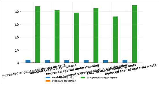 Figure 4 presents the trends in the participant feedback to demonstrate the changes in the perception of AI-enhanced education. On the same note, the fact that, in contrast to traditional forms, the AI can be used in a co-creative role is pointed out by the phrase, Boosted creative confidence (M = 4.4, 82%). The favorable score of the item of “Improved spatial understanding-M= 4.2) is related to the usefulness of working with 3D digital models, in which the learner can perceive the depth, proportion, and structure better. The results also demonstrate that AI tools encourage experimentation with 85 per cent people saying that these tools promote iterative creativity.