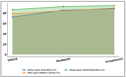 Table 2 is a comparative analysis of the visual feature extraction and interpretation of various CNN structures at the different network levels when used on tribal art patterns. These findings clearly show that InceptionV3 shows the highest overall performance with the highest scores in early, mid, and deep-layer analysis. Its activation of the first layer of 88 percent indicates its capability to detect fine edges and simple geometric shapes in a more effective way than the other models. This is mostly contributed by its multi-scale convolutional technique that operates features at varying receptive fields in parallel. Figure 3 draws a comparison of the layer-by-layer feature activation of various CNN structures. ResNet50 is also doing well particularly in deep layer motif detection where it scores 92, with its advantage lies in its residual connection which enhances gradient flow and allows it to learn deeper. Figure 3