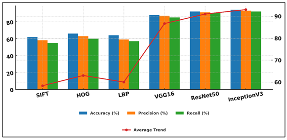 Table 3 clearly compares old image recognition methods, including SIFT, HOG, and LBP, with the new models in CNN that include VGG16, ResNet50, and InceptionV3. The findings indicate that there is a significant difference in performance, which proves the greater ability of deep learning methods to address the visual complexity of tribal art patterns. Figure 4 compares the performance of the different feature extraction and deep learning methods. Handcrafted features, used in traditional methods, attain a low degree of accuracy of between 62% and 66%. Figure 4