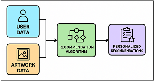 Figure 2 Data Pipeline for Virtual Gallery and Digital Archive Integration 3.3. Evaluation Metrics for Curatorial Relevance and Audience Engagement Testing of ML-based curation needs both computational and experiential measurements, which aim at quantifying the technical precision of algorithms and the effects on users. The metrics that are used to measure curatorial relevance are those that are typically used in information retrieval and recommender systems, such as precision, recall, F1 score, and mean average precision. These indicators are used to establish the performance of ML models related to identifying stylistically similar works of art, making suitable recommendations, and matching results with curatorial themes. More qualitative assessments by curator and domain experts are included to assess interpretive soundness, aesthetic continuity and narrative consistency in virtual exhibitions. Audience engagement metrics offer information on the way of interaction of the users with ML-curated environments. To get the richness of user experiences and determine the effectiveness of user experiences, behavioral indicators are recorded which include dwell time per artwork, depth of navigation, repetition, and frequency of interactions. The patterns of engagement in space are shown in the form of heatmaps and clickstreams, which identify the areas of the exhibition that receive the most significant attention. The comments and feedback sentiment analysis also helps in gaining knowledge of visitor satisfaction and interpretive resonance. 4. Machine Learning Models in Art Curation 4.1. Recommendation algorithms and personalization techniques The algorithms of recommendation are at the core of the art curation with the use of ML, which makes it possible to design exhibition journeys and provide individual discovery of the content in the virtual space. These systems are based on methods mostly utilized by the digital media platforms and adjusted to the cultural and aesthetic background of presenting art. One such tool is collaborative filtering, which finds out user preferences based on patterns common to other similar viewers and may use this information to recommend artworks or exhibitions that fit collective behavioral patterns. Content-based filtering, in its turn, analyzes the intrinsic characteristics of works of art, such as visual cues, stylistic signs and labels of themes, to arrive at suggestions that would be most related to the already formed interests. A combination of these to be more precise is hybrid models which prevent limitations of limited number of user data or ambiguous stylistic categories. Figure 3 stipulates architecture of recommendations towards personalized virtual art curation. Machine learning tools of clustering and dimensionality reduction also support personalization whereby artworks are clustered in meaningfully way or latent features space. Figure 3