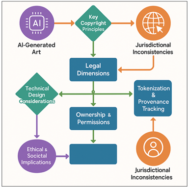1. INTRODUCTION The development of artificial intelligence has quickly changed the environment of creative production, and it has sparked enthusiasm and concern in artistic, legal, and technological circles. Machine-learning systems that have the ability to create images, music, literature and multimedia works pose a threat to traditional notions of creativity, authorship and intellectual property. Generative adversarial network (GAN)-based tools, diffusion-based architectures, and large-scale transformer architectures have enabled people with minimal technical expertise to create complex works of art that can compete with that of a professional. With such systems being more and more open and more and more autonomous, the boundaries between human creativity and algorithmic generation become indistinct and some of the most fundamental questions emerge regarding how these works are supposed to be controlled, attributed, and monetized in the modern digital ecosystems. The AI generated art presents new complexities in the management of rights Rathore et al. (2021). Classical copyright law is based on the assumption of a human author-conditioned requirement which is not consistent with the autonomous computational creativity of many types. In some regions that insist that manuscripts need to be authored by individuals to be eligible to be covered by copyright laws, the works produced by AI can usually find themselves in the legal grey areas, with creators, developers, and platforms unable to understand what they own or what can be used as derivatives. Other jurisdictions have already started to experiment with more liberal interpretations, meanwhile, without any international consensus having arisen Zeid et al. (2019). This makes the artist, collectors, and commercial entities that cross border so much more difficult since there is no legal uniformity, especially in the digital art markets where transactions often cut across jurisdictions. The Figure 1 illustrates the process of tokenizing AI art, where smart contracts are used to automate the ownership validation process, to enforce the right to usage, and to ensure transparent digital transactions. It is against this context of legal ambiguity that blockchain-based smart contracts are a potential breakthrough. Figure 1