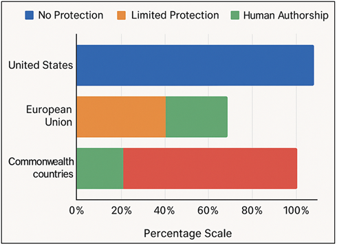 3. Legal Dimensions of AI-Generated Art 3.1. Outline key copyright principles and their ambiguity with AI-created works. The copyright law has been based on a number of principles that have been considered to be original, fixed, and human authored and all of them become unclear when it comes to the AI produced art. The originality criterion means that a human author has used skill, judgment or creative decisions but most of the present AI systems are made autonomously based on statistical patterns of training data. This poses the question of whether products that come out without any deliberate creative intention of the human can be considered the work of authorship. Equally, fixation, the need to have the work fixed in a physical form, is also usually fulfilled in digital forms, but the question remains, who does this fixing of the work happen when an algorithm brings about the generation Matarazzo and Torlone (2025). The greatest lack of clarity is the question of authorship. Generative systems do not presuppose identifiable creative expression by any single person, as copyright regimes have always assumed. Individuals who provide prompts, those who implement algorithms and those who provide training corpora by curating the dataset all play a part in the ultimate output, yet the law does not provide any explicit guidelines as to who should be credited with authorship Lai et al. (2024). Besides, the outputs of AI tend to be stylistically influenced or recognizable based on training data, thus whether such pieces are infringing or unauthorized derivative works. 3.2. Authorship, Ownership, and Derivative Rights Disputes The issue of authorship in AI-generated art is often between establishing who the creative input was and who was of good standing to receive legal protection. Prompt providers believe that their contribution to the final aesthetics is significant, whereas developers assume that the architecture and training of the model constitute the most significant creative gesture that makes generation possible. Creative influence could also be claimed by dataset curators whose collection determines the stylistic results. However, there is no common or distributed authorship across these crossed roles in existing laws, which consequently results in fragmented or undetermined ownership. The ambiguity of contractual conditions along with the usage of AI tools is the most common source of ownership disputes. Social networks frequently provide users with wide rights of use but at the same time, limit property or resale of the content created. Others of the services renounce all rights and the outputs are in the public domain whereas others claim to own their platform. Such discrepancies result in controversies as works of art acquire commercial significances or are assembled as part of a bigger body of creative works. Moreover, the human-AI workflows create challenges around the concepts of co-authorship, in which both parties have a significant influence on the end product. The point of disagreement in derivative rights is rooted in the fact that with the aid of AI, there is a chance that the generated outputs will replicate or be highly similar to the works of copyright in the training sets. 3.3. Jurisdictional Inconsistencies in AI Rights Recognition The legal framework on the treatment of AI-generated works is highly fragmented with global copyright systems treating the issue in different ways. The Copyright Office in the United States supports the position that only man-made works can be put under protection and specifically opposes the registration of outputs produced by AI-autonomous algorithms. The human contribution should be significant and imaginatively relevant, but the boundary is not defined, and creators have no idea whether timely engineering or model setup can be considered. In contrast, the United Kingdom and a number of Commonwealth jurisdictions have limited protection on the works of a computer-generated nature, with authorship being considered to the person who makes the so-called arrangements required to make the work. This is a bit enlightening but has been condemned as out of date and not enough driven to modern machine learning. Within the changing regulatory landscape of the European Union, there is still controversy on whether the output of AI is to be safeguarded, and whom to safeguard it using what category of law. There are those member states that focus on human authorship and others that are not closed to sui generis rights or hybrid protection mechanisms. At the same time East Asian countries have started to experiment with more liberal interpretations. As an example, jurisdictions may have allowed AI-generated materials to have limited rights when the input of human input is deemed relevant, and the standards are most diverse. The jurisdictional differences in regards to recognition and protection of AI-related rights are compared in Figure 2. These inconsistencies prevent the cross-border usage, distribution, and commercialization of AI-generated art. Figure 2