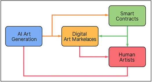Digital Art Ecosystems Nevertheless, the same technologies break the value hierarchies that are present in art ecosystems. The flood of AI-created content may saturate the digital market at the expense of originality and human artists may struggle to stand out in the crowd of the algorithmically generated content. It is possible that collectors have a difficult time in determining authenticity or aesthetic worth of art when it can be reproduced indefinitely with little human intervention. Moreover, capital accumulation is likely to be concentrated with operators of platforms, NFT markets, and AI developers, but not with individual creators, as with the Web2 economies of centralized pretenses. Volatility in crypto markets also increases the problem of sustainability. Long-term stability will be compromised by price speculation and token inflation as well as environmental concerns associated with energy-intensive blockchains. 7. Conclusion Artificial intelligence and blockchain technology merging are transforming the limits of the creative ownership, legal responsibility, and financial involvement in the digital art ecosystems. Traditional paradigms of copyright and authorship fail to keep up with algorithmic creativity as AI systems produce more and more sophisticated and original works of art. The ambiguities that come as a result, including how one determines who is the author, how the rights are shared and in what circumstances the rights can be applied, require some novel mechanisms that should work both legally and technically accurately. Such mechanisms can be described as a good premise of smart contracts. They offer a visible, resistant infrastructure of authoritative control, with self-executing code, to manage the claims of authorship, automate the stream of royalty and track the provenance of an item, the history of which cannot be altered. Smart contracts can resolve the problem between fragmented legal frameworks and decentralized technological systems through the combination of metadata standards, tokenization frameworks, and interoperability protocols. These tools however are not without limitations. The problem of discrepancy in regulations, scalability, authoring of AI, and the possibility of manipulating the metadata remain challenges that have complicated the application of AI in practice. In addition to technical and legal aspects of AI-generated art, there are the ethical and societal aspects of this art that require the same attention.