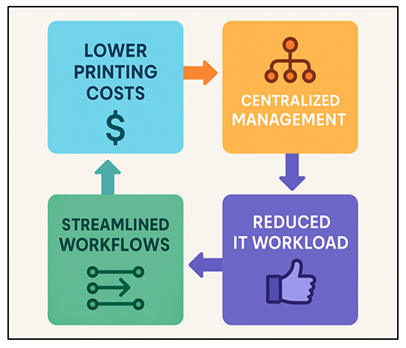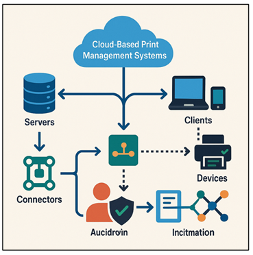 of Cloud-Based Print Management Systems with Network and Enterprise Systems 4. Key Features and Functionalities 4.1. Secure print and authentication mechanisms Cloud-Based Print Management Systems (CBPMS) use security as a pillar to make sure that sensitive documents are safe during the entire process of printing. Secure print release is also a major feature whereby print jobs are stored in an encrypted cloud queue until the user logs in at the printer thus avoiding unauthorized access to confidential contents. To authenticate, one may use a PIN code, ID card, biometrics or Single Sign-On (SSO) along with identity providers like Microsoft Azure AD, Google Workspace or Okta. CBPMS uses end to end encryption usually AES-256 and TLS to protect data sent across the network and stored data. This eliminates the chances of interception or manipulation of the print data between the clients, connectors, and printers. Moreover, administrators may establish role-based access control (RBAC) to specify printing rights, use colors or use certain printers depending on user roles or department. Audit trail and logging also contribute to a higher level of accountability since it checks the source, the destination and the usage of each print job. Multi-factor authentication (MFA) is also enabled in many systems to achieve increased security, especially in controlled sectors, such as the healthcare system and the financial sector. Zero-trust integration The integration with zero-trust security frameworks will make sure that all print transactions are authenticated prior to execution. 4.2. Print Job Routing and Optimization Cloud-based print management requires efficient routing and optimization of print jobs to achieve the maximum output and least possible costs. The system dynamically analyzes the print requests and decides on the most appropriate printer considering the factors relating to proximity, devices conditions, distribution of workload, and pre-established organizational policies. This smart routing will guarantee efficient use of printers that will cause fewer bottlenecks and downtime in the print network. Modern CBPMS techniques also use load-balancing algorithms to evenly distribute print jobs across the devices that are available to enhance the speed and productivity. Also, the policy based routing will enable the administrators to impose restrictions like defaulting large documents to a high capacity printer or directing the color jobs to a cheaper monochrome printer. Optimization is not only in routing, but also on bandwidth, compression and spooling efficiency. These characteristics reduce the latency and provide uniform performance of printing even when operating in a remote or low-bandwidth condition. Print job caching and deduplication are also supported by the system, and they minimize the network load and the server demand. Certain platforms use AI and predictive analytics to track pattern of use, anticipate malfunction of printers and suggest cost-cutting steps. An example is the analytics can be able to detect idle printers or color printing trends and direct procurement and sustainability programs. 4.3. Multi-Platform and Mobile Device Support The enterprises of the modern world are dependent on the various device ecosystems, and multi-platform and mobile compatibility is a highly important characteristic of Cloud-Based Print Management Systems (CBPMS). They will be compatible with Windows, macOS, Linux, and mobile operating systems including Android and iOS, and will offer a similar experience of print services without dependence on the type or location of a device. Users are able to start and control print jobs through web portals, mobile apps or built-in printer interfaces, which allow actual flexibility in hybrid and remote working environments. Cloud connectors offer driverless printing with standards such as IPP Everywhere, Google Web Print, or Microsoft Universal Print so no longer local printer drivers are required. Mobile support allows the employees to upload documents to the cloud queue and release them on-demand either by scanning the QR codes at a printer or by printing securely using smartphones or tablets. The compliance, security of devices, and restricted access to corporate print resources are guaranteed with the integration with the enterprise mobile management (EMM) and mobile device management (MDM) solutions. Moreover, CBPMS environments are likely to be enabled to BYOD (Bring Your Own Device) so as to allow contractors and remote workers to print safely without the need to connect to internal networks. 5. Benefits of Cloud-Based Print Management 5.1. Cost reduction and operational efficiency Costs reduction and enhancement in operation efficiency is one of the greatest benefits of Cloud-Based Print Management Systems (CBPMS). Conventional print setups demand dedicated servers, on-site driver installations and manual maintenance, which are all factors that make them costly in terms of initial capital and operational costs. Moving those functions to the cloud, organizations can remove the necessity of having on-premise print servers, decrease the investments in hardware, and decrease the overheads of maintaining IT. Cloud print management solutions utilize centralized management, which enables the IT teams to operate users, devices, and policies through a single dashboard. This saves time as well as reduces the load in troubleshooting driver conflicts and print queue errors. Efforts are also made to automate updates and monitoring of the device remotely to ensure the maximisation of uptime without any manual intervention. Additionally, the usage analytics and reporting tools allow determining which devices are underutilized or overprinting colors to make an informed decision on cost control. Figure 3 demonstrates that cloud print management is more efficient and it can save a lot of money. It can save up to 30-50 on paper and toner use by means of rules-driven