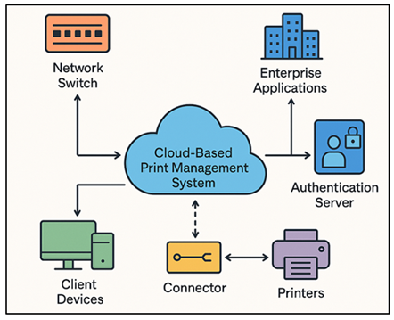 3. Architecture of Cloud-Based Print Management Systems 3.1. System components (servers, connectors, clients, devices) The Cloud-Based Print Management System (CBPMS) architecture comprises a number of components that are connected and collaborate to facilitate effective, secure and scalable print operations. In essence, the cloud print server is the central unit of control where the management console, the authentication service, the job schedule and analytics are found. It doesn't require the use of traditional on-premise servers and instead virtualizes print capabilities in a safe and multi-tenant cloud platform. Connectors are used as middlemen, which connect local print networks with the cloud Dan (2023). They provide a smooth channel between the organization infrastructure and the cloud system and usually multi operating systems are supported as well as printer protocols. Connectors do driver translation, data encryption, job forwarding and legacy devices can be connected to the modern environment. Clients- desktop agents and web interfaces and mobile apps adversely affect end-users by offering them access to printing services. They provide the option of users submitting jobs remotely and checking on print queues as well as authenticate using single sign-on (SSO) or identity providers such as Azure AD or Google Workspace. The output nodes are printers and multifunction devices (MFDs), which have embedded print agents, or to which a network protocol (IPP, LPD) is attached. 3.2. Workflow and Data Flow Models A Cloud-Based Print Management System has its workflow which starts when the user triggers a print job on a device he or she is connected to (desktop, laptop, or mobile application). The spooled document is encrypted locally and then the encrypted document is transferred to the cloud print service in a secure manner (with secure transport protocols HTTPS or IPPS). The cloud server identifies the user through the identity provider of the organization and implements the pre-determined print policies including duplex printing, color restrictions, or quota restrictions Ji et al. (2023). Upon validation, the system directs the job to the print connector which is a lightweight service that runs on the organization network and identifies the best printer depending on its proximity, availability, load balancing, or user preferences. This connector interprets the print information and transmits the information to the specific printer via the local network protocols. The data flow is streamlined, client, encryption, cloud queue, authentication, routing and the output device. In the process, analytics and auditing data like user ID, job type, and a timestamp are recorded. The user is able to release the job via secure interface or device-level authentication (PIN, card or biometric). This process guarantees confidentiality, efficient routing and responsibility of the data. 3.3. Integration with Network and Enterprise Systems An effective Cloud-Based Print Management System (CBPMS) should be built to work in sync with the enterprise IT ecosystems to provide a single control and security. Integration incorporates mainly network connectivity, identity management and enterprise applications. Within the framework of networking, the system uses hybrid communication models that span between local printers and cloud servers on the basis of secure VPNs, IPsec tunnels, or zero-trust network access (ZTNA) systems. This provides reliability when using print jobs as they will go through without the internal devices being exposed to other threats. The ability to be integrated with directory services like Microsoft Active Directory (AD) or Azure AD will enable centralized authentication, which will mean that users can use their current enterprise credentials and policies to do access control. CBPMS also connects with the enterprise resource planning (ERP), document management systems (DMS), and workflow automation systems to automate the document procedures. As an example, an ERP can automatically send invoices to secure print queues and scanned documents can be uploaded to cloud file storage or ECM (Enterprise Content Management) systems such as SharePoint or Google Drive. Figure 2 shows integration between cloud print management to network and enterprise systems. Figure 2