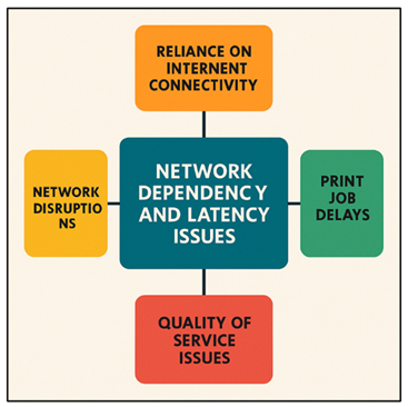 Reduction and Operational Efficiency in Cloud-Based Print Management Systems Work agility also enhances because the employees can be able to print securely anywhere without using complex VPNs and local network reliance. Less infrastructure and automation, as well as resource utilization, are a combination of lowered infrastructure and resource utilization, which is measurably translated into savings and more sustainable and high-performing print ecosystems that meet the modern demands of the enterprise. 5.2. Scalability and Flexibility for Organizations The Cloud-Based Print Management Systems (CBPMS) offer unmatched scalability and flexibility that enables the organization to respond swiftly to the changing business requirements. Conventional print systems cannot easily support expansion, and hardware upgrades and multifaceted setups are expensive. By contrast, the cloud-based systems are run on elastic designs, which allows the administrator to add a new user, printer, or location in minutes without needing to install more servers or drivers. The scalability has been noted to be especially useful to both multi-site and global organizations, where it is essential to have a similarity in the print environment across different regions. With centralized cloud control, IT departments could implement consistent print policies, performance monitoring as well as enforce compliance with all branches. 5.3. Enhanced Security and Compliance Capabilities Sensitive information is an area that businesses are worried about security and regulatory compliance, and Cloud-Based Print Management Systems (CBPMS) provide solid frameworks to deal with both. These are based on the zero-trust principles where all the users, devices, and print documents are authenticated, authorized, and encrypted before actions are performed. Documents are not intercepted or accessed by unauthorized parties in transit and storage because of the end-to-end encryption (AES-256/TLS) and secure print release functionality. The system also has multi-factor authentication (MFA), role-based access control (RBAC) and audit logging that enhance the defensive posture of the system in that only authenticated users view confidential print materials. With regard to compliance, the major CBPMS platforms are compliant with international standards and data protection acts, including GDPR, HIPAA, ISO 27001, and SOC 2. Inbuilt reporting and auditing functionality gives it traceability and makes it easier to prove compliance when performing internal or external audit. 6. Challenges and Risks 6.1. Data privacy and security concerns Although Cloud-Based Print Management Systems (CBPMS) have numerous benefits, they have a major data privacy and security risk that should be handled attentively. Since the print data passes through and is stored in the cloud facilities, it can be intercepted, accessed illegally, or leak out unless proper measures exist. Confidential data may be presented in sensitive documents which may include financial reports, medical records or legal contracts, in case of a leakage of this information, it may lead to regulatory fines or even damage to reputation. The main threats to the security are caused by the transmission of data, its storage, and policy of user authentication. Lack of adequate encryption, access restriction, or incorrect cloud settings can result in possible breach of the print information. Also, cloud platforms can be of a multi-tenant type, which can indicate a lack of privacy among organizations using the infrastructure with other customers. The regulatory compliances make the situation even more complicated since any enterprise should follow such frameworks as GDPR, HIPAA or ISO 27001 that provide strict regulations regarding data processing and storage. Lack of alignment between the policies of cloud service providers and the compliance needs of an organization may result in the audit gaps. The organizations are advised to deploy end-to-end encryption, multi-factor authentication, secure print release and secure access policies to reduce these risks. 6.2. Network Dependency and Latency Issues One of the inherent issues about Cloud-Based Print Management Systems (CBPMS) is that it is extremely dependent on network connectivity and performance. The fact that all print jobs are sent to cloud servers implies that any form of network failure either due to a lack of internet bandwidth or latency or internet outages can disrupt the printing services. The dependency may be especially intricate in the case of the organizations that are situated in the areas with unstable or slow internet infrastructure. The large file transfer, authentication, or spooling and transfering jobs to cloud servers can have latency problems. These can cause a frustrating user experience and productivity, particularly when printing in large volumes as in a school, hospital, or corporate office. Moreover, the job may fail or fail to deliver prints due to congestion in the network or overloaded routers. Figure 4
