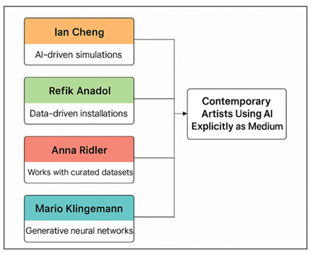 Interactions Between AI, Authorship, and Artistic Autonomy Consequently, the art piece is a compromise between the conceptual system of the artist and the internal logic of an algorithm, training history and computational tendencies. AI exhibits some kind of conditional autonomy: despite being programmed and instructed by human designers, its results are co-created by a complex network-based process that cannot be fully predicted and is not under the control of the artist. This independence brings a novel system-driven meaning, where the meaning of the artwork is created through the interactions of input stimuli, model structure, data biases, and inference of the algorithm. In this regard, AI does not act as much as a tool but more as a companion or an actor in the conceptual mechanism of the work. 3.3. AI-Generated Randomness, Patterns, and Computational Aesthetics The AI systems have brought about unique types of randomness, pattern generation, and computational aesthetics that can be utilized as conceptual frameworks in the modern art practice. In contrast to the conventional notion of randomness: chance operations in Dada or Cagean indeterminacy Generative unpredictability generated by AI can be seen through the use of complex statistical models, nonlinear transformations and the sheer number of possibilities of the learned representations of AI. This presents outputs which waver between coherence and deviation and gives the artist the ability to investigate the edge of structure, error and emergence. The latent patterns in training data are frequently produced by AI it can expose biases, repetitions and tendencies which are concept rich in their own right. These patterns have the capacity to reveal the latent structures of visual culture, linguistic behavior or data archives of groups. Artists may apply these pattern of computation to critique regimes of classification, representation, and surveillance or draw images of the abstract dynamics of machine thoughts. The conflict that exists between emergent order and algorithmic noise turns into a conceptual instrument, which enables artworks to pre-empt the aesthetics of computation itself. AI-generated computational aesthetics are unlike other established artistic forms and styles in that they have their basis in statistical inference, and not gesture or intentional creation of form. 4. Artistic Precedents and Case Studies 4.1. Early algorithmic and computational art as conceptual foundations The history of AI-driven conceptual art has its origins in the early algorithmic and computational art of the 1960s and 1970s which provided the critical precedents of viewing technological systems as meaning-making machines instead of a production means. Artists like Vera Molnár, Frieder Nake, and Manfred Mohr also explored the use of programmed instructions and mathematical logic to make artworks that predicted process, rule-based behavior and aesthetics of computation. These were the conceptual works, as the algorithm was the main artistic suggestion, instead of the completed visual representation. The piece of art was the implementation of a concept using a system and is quite akin to the conceptual approaches of highly conceptualizing contemporary art, focusing on dematerialization and the dominance of thought. These innovators proved that in a random way, permutation, and computational decision-making can be artistic tools that can create new aesthetics possibilities. Notably, they disclosed that machines are capable of being involved in creative procedures, despite having to work under strict guidelines. Their plotters, primitive computers and generative instructions formed a legacy of rule-based art and systemic art that would eventually be the foundation of conceptual frameworks of AI-based art. 4.2. Contemporary Artists Using AI Explicitly as Medium In the twenty-first century, there is a tendency of a further rise in artists who have embraced the use of artificial intelligence as not merely a tool of production but a medium of central concern, which influences the conceptual logic of the piece. These artists use AI in order to challenge the systems of knowledge, to explore what can be perceived by machines, and to challenge the notion of authorship and creative agency. Ian Cheng, Refik Anadol, Anna Ridler, and Mario Klingemann are among the most well-known artists who have employed neural networks, generative adversarial systems and big data to produce artworks whose meaning is formed through the workings of an algorithm. The live simulations offered by Ian Cheng, e.g. involve AI-controlled agents that create new narrative ecosystems with developing narratives, where characters act independently, casting doubt on the intentionality and lack of predictability. Figure 3 points out the AI-informed approaches to the modern-day conceptual art practices. The data-driven installations by Refik Anadol restructure the archival databases into the visual worlds, implying that data processing by machines may demonstrate patterns of group memory and perception. Figure 3