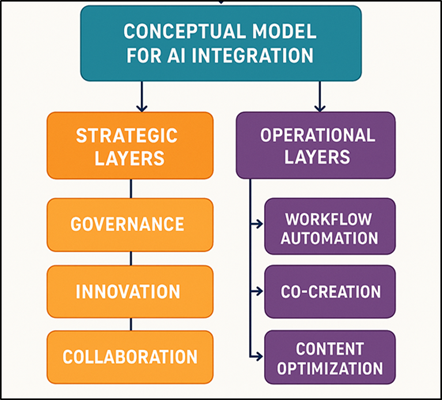 3. Methodology 3.1. Research design and approach (qualitative, quantitative, or mixed) The current research design is a mixed-method research design to guarantee an in-depth study of AI integration in the management structure of the creative industry organization. The mixed-method methodology is a mixture of qualitative exploration to get a deeper conceptual understanding and quantitative validation to ensure empirical rigor. The qualitative stage will include the in-depth interviews with the creative specialists, industry leaders, and AI technologists to find out their perceptions, challenges, and strategies of the human-AI collaboration. The experience of this stage guides the conceptual framework of the suggested management scheme in the sense of the subtle interaction between technology, creativity, and organizational culture. The quantitative stage is the one that uses structured surveys and metrics of performance assessment to test the effectiveness and scalability of the proposed framework. The sample is a representative one that is gathered in various creative industries, such as digital media, design, music, advertising, and film production. Relations between dimensions of frameworks: governance, innovation, collaboration, and automation are analyzed by means of statistical techniques, including regression analysis and factor modeling. Such a mixture of approaches makes it possible to be both interpretively rich and objectively valid; so the framework is based not only on practical realities but also on theoretical knowledge. The combination of the results of both methods brings a comprehensive interpretation of how AI can be used to improve creative management systems without losing its originality and sparing its moral and cultural values. 3.2. Evaluation Parameters and Analytical Models In order to assess the suggested AI-based management system, research uses multidimensional evaluation parameters which assess both operational and strategic effectiveness. Strategic parameters are the capability of innovation, the flexibility of the governance, the adherence to ethics and the cooperation with stakeholders. These indicators evaluate the alignment of AI usage to creative and business goals by organizations in a way that prevents irresponsible use of technology. The operational parameters quantify the workflow efficiency, automation coverage, quality of creative output and the co-creation effectiveness and reflect the actual performance of AI-driven processes in the real world. The modeling framework applied in the analysis is an analytical modeling framework that incorporates both descriptive and inferential. Descriptive statistics indicate the distribution of the major indicators within the creative industries, whereas such an inference tool as structural equation modeling (SEM) and multi-criteria decision analysis (MCDA) are used to determine the correlation between framework elements. A model of balanced scorecard is worked out to visualize trade-offs between the innovation performance and the ethical sustainability. Another approach used is the fuzzy analytic hierarchy process (FAHP) to rank framework components according to the industry weightings and expert judgment. 3.3. Validation and Reliability of Framework Components The validation and reliability of the given framework are guaranteed with the help of a multi-stage process of assessment that includes expert evaluation, statistical validation, and tests in different sectors. The conceptual framework is validated in the first stage during the Delphi rounds among the academic scholars, creative directors, and AI practitioners. Their response will be used to fine-tune the constructs making them theoretically sound and contextually relevant. The validity of the contents is determined through the alignment of the components of its framework; governance, innovation, collaboration, and operational automation to the known management and AI adoption theories. The reliability test is done in the second phase, which is done on Cronbach alpha and composite reliability score to determine the internal consistency on the evaluation parameters. The constructs are also tested on a variety of indicators and the test is known to be stable and coherent. The third step is the confirmatory factor analysis (CFA) to test the structural soundness of the framework such that the variables that are observed are true measures of the latent measurements of creative management. To be empirically validated, the framework is applied in case studies on four sub-sectors; the media production, advertising, technology in music, and digital design. Comparative outcomes are examined to find out transferability and adaptability in domains. The trustworthiness of the results is increased with the help of triangulation methods, which include a mixture of interview data, survey results, and performance data. 4. Proposed Management Framework 4.1. Conceptual model for AI integration in creative workflows The conceptual framework of AI integration, which is proposed in creative workflows, creates a comprehensive system in which the human creative capacity is integrated with technological intelligence and strategic governance. It is based on three pillar points of strategic alignment, operational augmentation and creative collaboration. Based on its core, the model does not consider AI as a substitute to human imagination but as a multiplier of the creative potential that allows achieving new ways of forming ideas, designing thinking, and creating production efficiency. The model highlights interactions between human intuition, machine learning engines and organizational strategy in order to make sure that creativity is genuine, ethical and cost-effective. This model works in a cyclical way that involves the generation of data-led insights, synthesis of creativity, algorithmic refinement, and human regulation. It facilitates two way learning, with human creators t