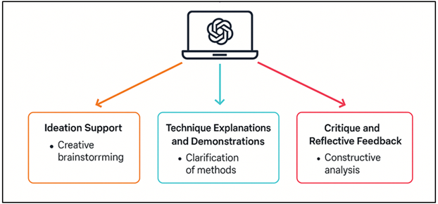 3. ChatGPT’s Co-Teacher Capabilities 3.1. Ideation Support ChatGPT is an interactive ideation collaborator, which promotes the creative thinking and conceptual growth of art education. The conventional art classroom would strongly focus on brainstorming in the forms of discussion and peer feedback, but this process is only scalable to some degree due to time and classroom capacity. ChatGPT develops this interactive creative conversation by rephrasing or devising personalized prompts, recommending themes, and offering contextual inspiration inspired by various artistic traditions, movements and media Hall and Schofield (2025). It assists learners to overcome the state of creative paralysis by providing associative lines of thought or connecting an initial thought (say, the feeling of urban solitude) with applicable artistic methods, emotional colors, or compositional structures. Due to the ability of the AI to adjust its language and tone to the cognitive level of a learner, the AI can be used to teach beginners and advanced students. ChatGPT, for example, can be used by novices to discover baseline concepts of form, proportion or symbolism, and advanced students to develop conceptual scripts as per certain aesthetic theories. ChatGPT can be used to generate so-called creative dialogues, where students should express their artistic purpose and play with metaphors, stories, or visual symbols Oppenlaender et al. (2023). Notably, the process fosters divergent thinking- assisting students in coming up with several possible paths to take, and choosing the most interesting. 3.2. Technique Explanations and Demonstrations The other important role that ChatGPT can play as a co-teacher is the possibility to explain techniques and recreate demonstrations with both traditional and digital art forms. In practice within the studio setting, students may need instant clarification on the material, brushwork, color mixing, effect of light or computer capabilities. ChatGPT fills this gap with real time conversation, offering step-by-step procedural information, safety protocols, and historical or stylistic information that provides a contextualization of every method Prunkl (2024). To use the example of students who asked ChatGPT questions relating to chiaroscuro or impasto painting, it can demonstrate both the theoretical background and the technical process, along with the names of artists who were one of the pioneers of the technique. ChatGPT can walk learners through the software workflow of apps like Adobe Photoshop, blender, or procreate: giving specific information related to layers and lighting in 3D modelling (or texturing). ChatGPT helps to combine visual learning with theoretical description and articulation by means of the introduction of multimodal prompts (e.g., links, references, or descriptive words). 3.3. Critique and Reflective Feedback Art education cannot be done without a critique, which helps to develop self-awareness and aesthetic sensitivity. ChatGPT can make this process more effective by simulating dialogic critique sessions that will help the students go through self-evaluation and structured reflection. Figure 2