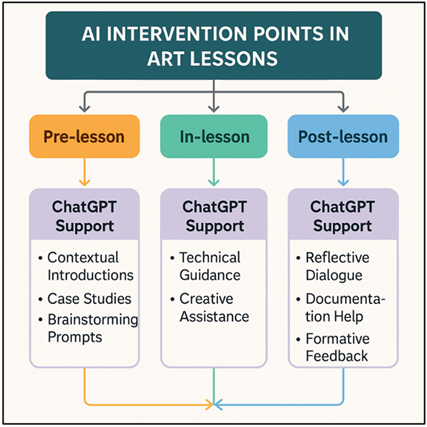 Figure 2 ChatGPT-Assisted Critique and Reflective Feedback Process Responses of the AI are interactive and descriptive as compared with the static rubrics - asking learners to interpret composition, balance, colour balance, and thematic integrity by posing Socratic questions. Figure 2 illustrates the ChatGPT-mediated critique process of improving reflective feedback in art education. As an example, uploading or writing about an artwork, ChatGPT can provoke a student to think outlining the approach to contrast or asking the following questions: How does your use of contrast reinforced the emotional tone? Which compositional element catches the attention of the viewer first? ChatGPT builds emotional safety and emotional resilience, which are essential in the creation development by taking the approach of reframing criticism as a positive dialogue instead of condemnation. It is also able to give comparative analysis, which makes reference to styles or movements (e.g., surrealism, cubism, expressionism) to enhance critical awareness. Besides, ChatGPT may help teachers to create thought-provoking questions not only on the technical level but also on the conceptual level, including material processing, symbolism, and narrative unity. In the case of a group, peer-review exercises can be moderated by the AI, and the feedback should be objective and respectful. Moreover, it allows long-term assessment of artistic development due to its ability to follow past encounters. In combination with human feedback, the responses of ChatGPT deepen multidimensional critique, which is a combination of human intuition and computational view. Finally, this strength will promote reflective education, artistic self-confidence, and progressive learning- to convert the criticism into a conversation between the student, the teacher, and the AI co-teacher. 4. Pedagogical Model Design 4.1. Teacher–AI Collaboration Structure The proposed pedagogical model creates a symbiotic relationship between human teachers and ChatGPT as co-teachers basing on the collaborative pedagogy and constructivist learning theory. The teacher will keep the role of mentor, evaluator, and ethical guide, and ChatGPT should be used as the dynamic facilitator, which can provide support that is scalable, adaptive, and responsive to the situation. This collaboration enables a multidimensional model of instruction that human creative efforts and AI intelligence will be complementary to each other and benefit learning. The curriculum structure, learning goals, and overall tracking of artistic development are created by teachers, but ChatGPT helps to operationalize them by communicating with the student, providing personalized advice, and creating content in real-time. As an example, ChatGPT can be used as a supplementary interlocutor during conceptual brainstorming or critique sessions so that each learner gets a constant feedback irrespective of the size or the place of a classroom. The analytics features of ChatGPT also allow teachers to measure the progress of students, detect their weak points, and optimize teaching in order to address their gaps. 4.2. Activity Flow with ChatGPT Integration A successful activity flow will incorporate ChatGPT in the art education process in such a way that AI will become an invisible but uninterrupted partner. The learning cycle starts with Preparation in which the teachers present the project theme and the objectives. ChatGPT will help by providing prompts, reading between the lines, or even visual texts that may arouse curiosity and help students pursue their idea. ChatGPT helps in ideation and implementation during the Creation Phase that is facilitated by an iterative dialogue. It provides technical descriptions, style inspirations, or optimization tips in a workflow, according to the requirements of the student. ChatGPT can be engaged by learners to discuss the choice of materials, composition techniques, or colour colourfulness, and creative authenticity and emotional expressiveness are managed by the teachers. The Feedback Phase entails the critical reflection. In this case, ChatGPT offers a methodical feedback in a non-judgmental, descriptive form so as to promote self-evaluation. The students discuss their creative intentions, and the AI points out the strengths in composition and the ways to improve it. This feedback is then put into context by the teacher in larger aesthetic or cultural contexts. Such a formal workflow will help AI play a significant role at each phase of the process, such as development of the concepts and reflections, without dominating human mentorship. In this way, ChatGPT incorporation facilitates a creative and interactive and iterative learning process that links the creative aspect of art education with critical thinking. 4.3. AI Intervention Points in Art Lessons Incorporation of ChatGPT into art classes must be purposeful regarding the intervention points that need to be identified in order to add value to human teaching using AI services. One can identify several of these points, namely Pre-lesson, In-lesson, and Post-lesson interactions, which have a different pedagogical role. In the Pre-lesson Phase, ChatGPT facilitates background interaction with the lesson based on contextual introduction, case study of artists, and brainstorming prompts that are specific to the goals of the lesson. Figure 3