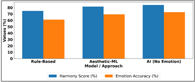 Table 2 is a quantitative comparison of the baseline color modeling approaches showing gradual improvements with the sophistication of the algorithm. A rule-based color theory model has a harmony score of 74.8% and emotion prediction accurateness of 61.2 only and consists of relatively high valence and arousal errors (0.182 and 0.196, respectively), which yield a lesser user satisfaction (68.5%). Figure 3 compares the performance in predicting colors and emotions in various approaches. Figure 3