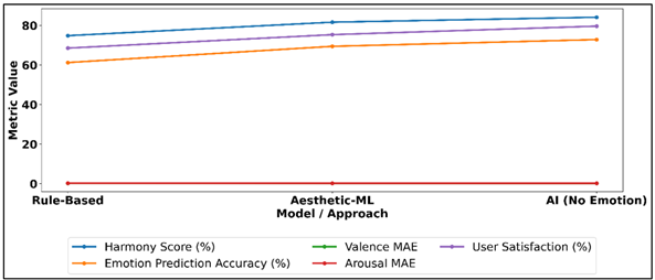 Figure 3 Comparison of Color Harmony and Emotion Prediction Across Approaches The integration of machine learning yields better results: aesthetic-only ML model increases harmony to 81.6% (+6.8%), emotion accuracy to 69.4% (+8.2%), and decreases valence MAE to 0.154 and arousal MAE to 0.167, which results in increased satisfaction (75.3%). Figure 4 shows the performance trade off in harmony, emotion accuracy and satisfaction. The AI color recommendation system also contributes to better visual results, scoring 84.1% harmony and 79.6% user satisfaction, and having less affective errors (0.141 valence, 0.158 arousal). Figure 4