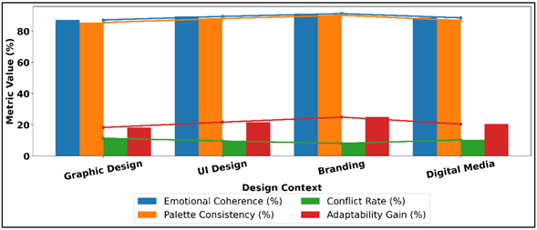 The emotional coherence and design effectiveness of the proposed framework are summarised in Table 3 and show a strong performance with a significant variation between different applications. Branding and identity design score the emotional coherence with the highest mark of 91.3, the palette consistency rate (90.2), and the lowest rate of emotional conflict (8.1). This implies that color harmonies that resonate with the emotions of the consumer are especially effective in an area where a definite brand emotions and limitations exist. The coherence of emotions and palette metrics in various design situations is compared in Figure 5. The user interface design also scores highly and has both emotional coherence and palette consistency score of 89.5-88.1 with low conflict score of 9.6 which favors adaptability win of 21.7 in dynamic interface situations. Graphic design shows a slightly lesser coherence (87.2) and a greater conflict (11.4) which is an indication of the wider stylistic variety and freedom of expression. Figure 5