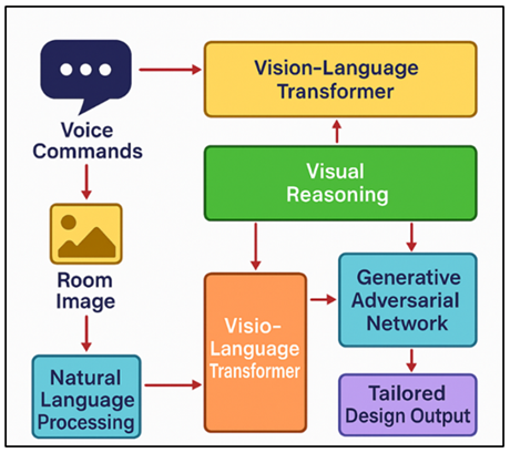 1. INTRODUCTION The short development of artificial intelligence (AI) technology has had a large effect on many fields, converting how humans connect to computers and making person studies more customized. Interior format has gained the most from AI-driven improvements, which have modified the way conventional plan is carried out to make it less difficult for all people to apply and extra personalized. In the past, interior design relied a lot on visual interfaces that required complicated software, a lot of user involvement, and specialised knowledge. That being said, the rise of AI-powered voice helpers like Amazon Alexa and Google Assistant has opened up new ways to have natural, conversational interactions that make things easier on the brain and bring advanced design tools to more people. Even with these improvements, most of the voice-based systems used in interior design have only been able to do simple automation jobs Edén et al. (2024). They haven't been able to do the complex visual thinking and personalisation that is needed for complex space aesthetics. Thus, there is still a pressing need for advanced multimodal AI helpers that can combine spoken orders with complex visual thinking and analysis. To fill this hole, our have a look at provides a brand-new voice-based AI helper created just for customized indoors sketch. It combines advanced visual logic driven through multimodal deep learning with natural language processing (NLP) strategies. Imaginative and Vision-language transformers (VLTs) and generative adverse networks (GANs) are used inside the suggested gadget to assist it as it should be understand voice orders from users, take a look at room plans visually, and give you custom design answers in actual time Thirumuruganathan et al. (2021). Through letting users obviously specific their diagram options as an instance, via inquiring for precise colour schemes, furnishings preparations, or stylistic modifications the AI assistant makes the interaction method a great deal simpler. Which means that professional-degree graph is out there to folks that are not technically professional or acquainted with conventional format equipment. Visible reasoning is also used to make certain that the guidelines made are correct in terms of each aesthetic team spirit and bodily usefulness. That is in contrast to standard recommendation engines that commonly only use written or simple visible inputs Wei et al. (2022). This observe could be very essential to the sector of customized indoors sketch because it suggests how voice-driven AI helpers can enhance consumer reports by using making plan interactions extra natural and open to every person Rzepka (2019). It also looks at how multimodal capabilities which encompass tacking, seeing, and generative design can trade the method interior graph is commonly done, setting a new popular for AI structures that could connect to people. In the long run, this approach now not only improves how human beings and AI connect, but it also has the capacity to be used in greater associated areas, inclusive of shop visualisation, clever home settings, and virtual staging for real estate. Figure 1