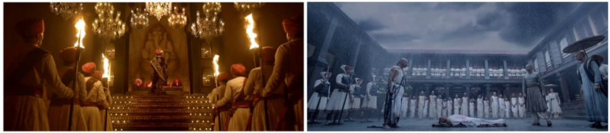 #Prime) The introduction of Malik Kafur demonstrates how color codes deepen character construction. His first appearance in white suggests innocence and virtue, but this impression is quickly unsettled. The same white cloth he wears is later used to clean the blood of his victims, exposing the tension between outward purity and inner violence. This transition functions as a sign of duplicity, reminding viewers that appearances often mask truth. Kafur’s later allegiance to Khilji is marked visually by a shift to black Figure 9. Bhansali repeats this strategy with Alauddin himself. When Ratan Singh visits Khilji’s camp, Alauddin dresses in white but covers himself with a black shawl, a subtle signal of hidden treachery and his intent to abduct the Rajput king. In another scene, after killing Jalaluddin, Alauddin abandons his usual black and dons dark red, symbolizing blood, conquest, and authority. Mehrunnissa appears in matching red, and Kafur later follows this palette, visually placing him close to Alauddin. Such coordinated shifts expose how power, sexuality, and allegiance are intertwined. Figure 10