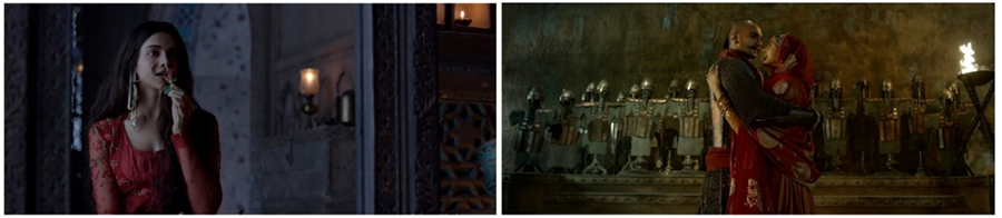 "Bajirao Mastani" (Streaming/Source: #EROS) Red carries the powerful symbolic weight in this film. The character of Mastani (Deepika Padukone) typically wears light-colored clothing. However, she wears a striking red dress in two specific instances Figure 2. When Bajirao prepares to leave Bundelkhand, Mastani is dressed in red before a mirror, holding a rose. The scene suggests longing, but also foreshadows separation. This choice can be better understood through the lens of social semiotics. Red represents a sign that encodes both emotion and imminent loss. It becomes a marker of love under threat. The second time Mastani wears red is inside the armory as Bajirao departs for war. The color recalls a visual echo from Padmaavat, where Padmavati, played by the same actress, is also clad in red before her husband’s departure. The resonance links two stories of sacrifice. In both, love ends in tragedy yet finds permanence through death. It shows how Bhansali reworks historical narratives to fuse love, devotion, and death into a new cultural memory. Red dominates another sequence during Ganesh Puja. The room glows in crimson as Mastani faces an attack. Kashi Bai enters in white with a red sash, further layering meanings of purity and peril. Here, red heightens tension, making visible the danger that surrounds Mastani. Figure 3