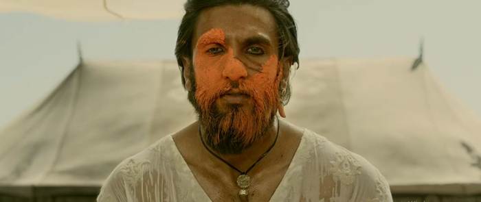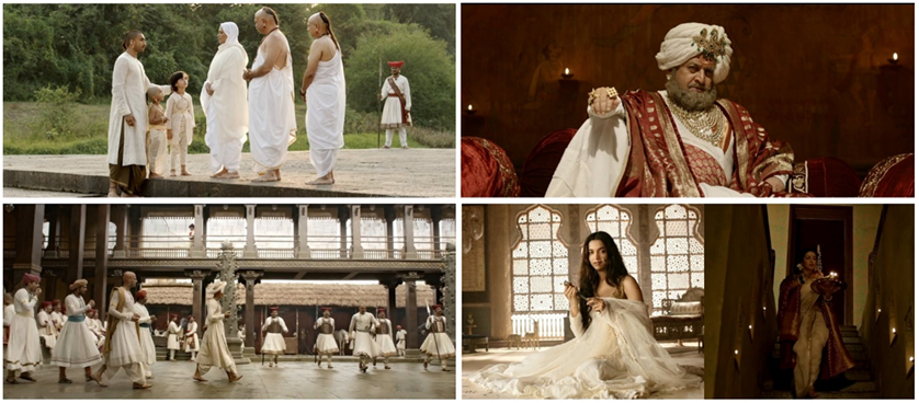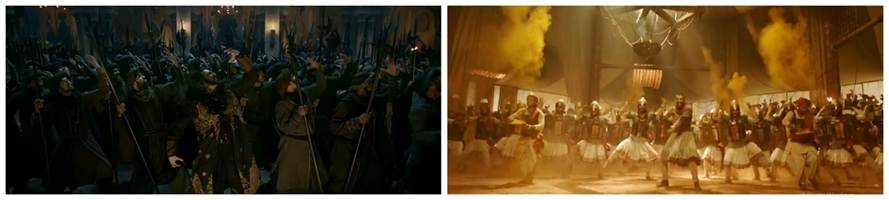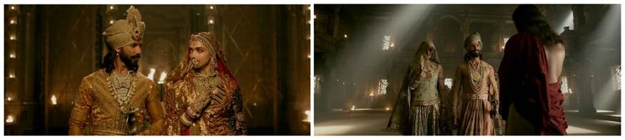 “Padmaavat” (Streaming/Source: #Prime) The pairing of colors between Padmavati and Ratan Singh is carefully staged to express unity and royal stature Figure 7. Their costumes often mirror each other, turning clothing into a visual language of love and power. After their wedding, Padmavati, in red and gold, walks beside Ratan Singh in saffron and gold, creating harmony between passion and valor. Later, when they meet Raghav Chetan, both appear in lighter shades with green headgear. The green highlights prosperity and balance, while the matching tones symbolize their shared identity. Through social semiotics, these choices frame the couple as inseparable, embodying dignity, devotion, and cultural continuity. By contrast, Alauddin Khilji’s costumes carry darker palettes—black, grey, and muted earth tones—crafted from Ottoman references, manuscripts, and motifs like Chinar Butti and sacred geometry. The subdued palette signals barbarism, desire, and excess. His introduction in Afghanistan sets the tone, where furs and heavy textures present him as crude and uncultured. Through social semiotics, this visual scheme encodes Khilji’s otherness, positioning him outside refinement and morality. Such decisions also illustrate how Bhansali rewrites history within a postcolonial framework. The Sultanate, in reality, was vast and multi-ethnic, stretching from Afghanistan to the Deccan. Yet in the film, its cultural breadth narrows to dark interiors and exoticized fabrics. This visual reduction reinforces binaries: the Rajput world is light-filled, ritualistic, and sacred, while the Khilji world remains shadowed, primitive, and dangerous. Color becomes an ideological tool, shaping not only individual characters but also the larger imagination of Hindu-Muslim duality in historical cinema. Figure 8