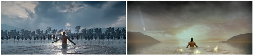 Color in "Bajirao Mastani" (Streaming/Source: #EROS) War victories appear less significant when compared with the battle for personal love, which Bajirao ultimately cannot win. The final lake sequence completes this cycle. Bajirao, weakened by fever, enters the lake holding his sword Figure 4. He sees a spectral army of soldiers dressed in black, riding black horses and carrying black flags. The color black here becomes a sign of death and destiny. It reflects the weight of his family legacy and the inevitability of his fall. The scene is graded in cool blue tones that intensify the feeling of delirium and isolation. As the vision unfolds, the sky changes suddenly. Dark clouds break into fiery shades, and meteors fall across the frame. The transition from black to flame works as a metaphor for passage. Blue grading intensifies the mood before the sky bursts into fire and meteors. Through social semiotics, the sequence shows how colors and natural elements become signs of closure. Here, characters merge with universal nature, suggesting an eternal togetherness beyond mortality. 6.2. Padmaavat (2018) In Padmaavat, saffron and yellow dominate the Rajput world. The saffron hue is carried over into the opening credits as well. These shades, linked with purity and renunciation, also serve as battle colors of the warrior caste. Padmavati, Gora Singh, Badal Singh, and the Rajput soldiers wear them often. Through costume, the film encodes valor and piety, turning color into a cultural sign of identity and faith. Even the color grading of this film operates as a semiotic code that separates cultural spaces. Chittor is consistently framed in warm yellow, which conveys harmony, devotion, and sacred order. In contrast, Delhi is shaded in cooler blues, highlighting distance, suspicion, and disorder. A rare exception occurs in the forest scene where Padmavati accidentally wounds Ratan Singh. Here, blue dominates to reflect mistrust and uncertainty. As the narrative moves from conflict to intimacy, the palette shifts toward yellow, visually translating reconciliation into cultural memory. Figure 5