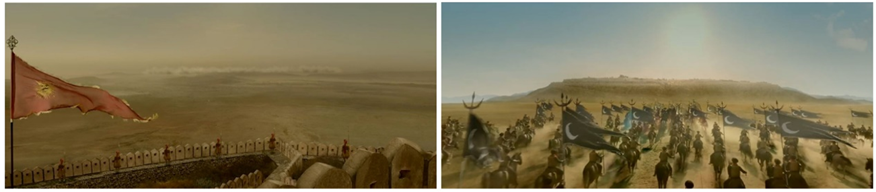 the Rajput and Alauddin Khilji Flags in “Padmaavat” (Streaming/Source: #Prime) The flags in Padmaavat carry crucial symbolic meaning Figure 5. Ratan Singh’s realm is marked with red, a color tied to purity, sacrifice, and sacred fire. In contrast, Alauddin Khilji’s empire is identified by a black flag. Black here is not neutral but a sign of evil, otherness, and corruption. The duality creates a clear moral boundary between kingdoms, reinforcing the film’s theme of good against evil. Yet the depiction is not historically accurate. Records suggest a green banner with black bands for the Sultanate. Bhansali’s decision highlights cinema as interpretation rather than history. Through social semiotics, the flags become signs that project ideology. They transform political struggle into a visual battle coded through color. Furthermore, just like in Bajirao Mastani, colors in Padmaavat also make political statements when we see Alauddin and his soldiers constantly dressed in black. Although the imperial army of medieval India was multi-ethnic and multi-religious, Alauddin's warriors are portrayed as being exclusively Muslim. The Rajput army, believed to be entirely Hindu, emerges as a vast expanse of saffron. Similar to Pakistan's flag, the Khilji banner features a crescent moon on a deep green background. Early 20th-century Bengali adaptations of the Padmavati mythology employed similar symbolism, using images such as the crescent moon engulfing the sun to depict the conflict between the Hindu Rajputs and the Pathan Tar troops of Alauddin. Figure 6