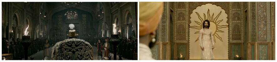 Courtroom in “Padmaavat” (Streaming/Source: #Prime) Padmaavat builds its narrative through deliberate contrasts in color that extend beyond costumes into architecture, interiors, and battlefields Figure 8. Chittor’s court is consistently framed in luminous hues, its bright walls and decorated durbar reinforcing an image of virtue and moral clarity. By contrast, Khilji’s spaces are steeped in shadow and muted tones, casting his rule as dark and threatening. This opposition is not subtle; it frames Rajputs as idealized figures while rendering the Sultanate devoid of virtue. Critics may question the historical accuracy of this binary, yet the design choices clearly function as signs of identity politics. Even the first meeting between Alauddin and Ratan Singh in Chittor illustrates this chromatic coding. Alauddin remains in black and grey, while Ratan Singh appears in red, a color of bravery and defiance. Padmavati and Ratan Singh’s differing attire in the same moment further underlines marital discord, echoing visual tensions also staged between Alauddin and Mehrunnissa. Alauddin first glimpses Padmavati through her reflection while she is dressed in white. The costume conveys purity, dignity, and wisdom, but also evokes dissidence between Padmavati and Ratan Singh. Figure 9