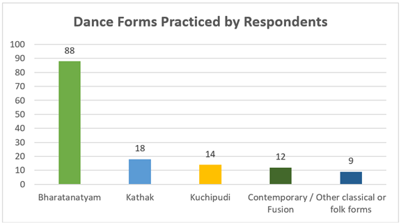 Figure 4 Dance Forms Practiced by Respondents It is evident that the distribution of dance forms exhibits that of Bharatanatyam being the predominant of the respondents. Of the total sample 141 people were found to be practicing Bharatanatyam with 88 being the total percentage of whom practice Bharatanatyam. This shows that almost two thirds of the practitioners in the research are practicing this classical form and thus it is the primary focus of the group of participants. Kathak is practised by 18 participants whereas Kuchipudi have 14 practitioners. Modern or fusion styles entail 12 participants, whereas other classical or folk genres have 9 interviewees. Such reduced numbers indicate that, despite the presence of various traditions of dance, they are a secondary representation to Bharatanatyam. The high density of Bharatanatyam allows seeing the topicality of the title of the study and guarantees that the results on gender inclusivity will be based on the experience of the representatives of the largest classical tradition. Figure 5