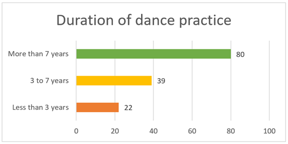 Figure 5 Duration of Dance Practice The sample distribution of the experience of dancing is that a majority of the sample is made up of long-term dancers. Eighty (80) of the respondents, who constitute 56.73 percent, have experienced over seven years of practice in dancing. This implies that more than 50 percent of the participants have been engaged and heavily exposed to training and performance and the cultural setting of dance. This kind of experience implies an adult knowledge of professional and social processes in the profession. The other 39 respondents, or 27.65 percent, are of three to seven years of practice. This category represents the intermediate practitioners who still are developing but have already structured training backgrounds. The third group with the least percentage of respondents is the 22 who have less than three years of experience. These respondents are beginners or novice learners. In general, the trend is that the research includes the views of largely experienced dancers that makes their opinions more valid on the subject of gender inclusivity and discrimination within the dance community. Figure 6
